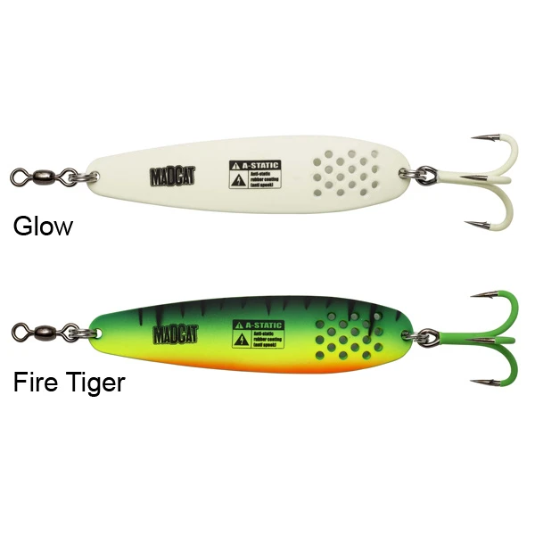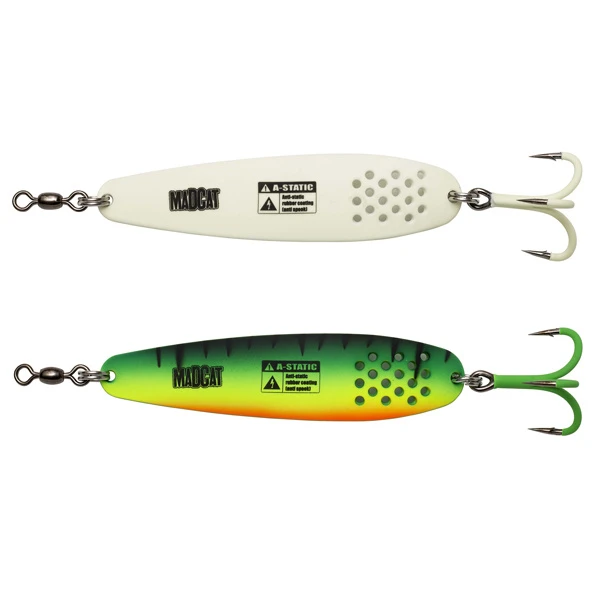 De Mad Cat A-Static Turbine Spoons geven door de gaten in de lepel meer vibratie dan de gewone lepel en zijn daardoor nog attractiever. Deze lepel is uitgerust met een heavy duty splitring, wartel en een ultra scherpe en sterke dreg. Daarnaast is de Mad Cat A-Static Turbine Spoon voorzien van een gecoate body en A-Static haken om het elektrisch veld dat de meerval kan afschrikken te minimaliseren.