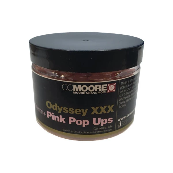 De CC Moore Odyssey XXX Pink Pop-Ups beschikken over een hoog drijfvermogen, hierdoor zijn ze perfect uit te balanceren. Dankzij de opvallende roze kleur zullen deze pop-ups snel door aanwezige karpers worden opgemerkt. De Odyssey XXX Pink Pop-Ups zijn voorzien van dezelfde ingrediënten als de Odyssey XXX Boilies, hierdoor zijn ze perfect te gebruiken i.c.m. alle andere producten uit de Odyssey XXX Range.