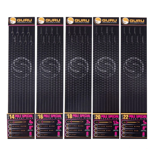 De Guru Pole Special – Ready Rigs zijn speciaal ontworpen voor het vissen met de vaste hengel en zijn perfect voor het gebruik van aassoorten als maden, casters, pieren zelfs vers de vase. Deze onderlijnen zijn voorzien van Pole Special haken met weerhaak en zijn geknoopt van Guru N-Gauge lijn. Alle onderlijnen zijn qua lijndikte op de haakmaat afgestemd.