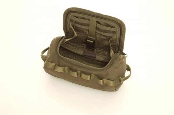 De NXG Wash Bag van Trakker is voorzien van twee vakken met rits aan de binnenkant, meerdere elastische straps aan de buitenkant, waterdichte onderkant en een ingebouwde spiegel.